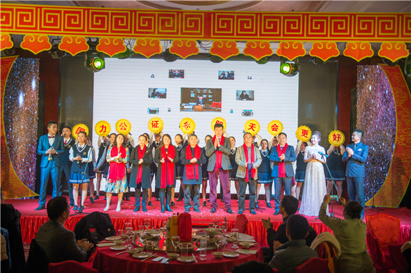 2017年1月16日下午两点,四川省成都市国力公证处2017年新春团拜会在帝盛君豪酒店七楼宴会厅成功举办。四川省公证协会会长扎柯,四川省司法厅律师公证管理处副处长梅勇,四川省公证协会秘书长曾平,成都市司法局公证工作处处长陈文威,成都市司法局公证工作处副处长、成都市公证协会秘书长张一民,四川省公证协会常务副会长、律政公证处主任李勇,四川省公证协会副会长、成都公证处党支部书记向海平,四川省公证协会副会长、蜀都公证处主任李可,蜀都公证处副主任钟良,中大公证处主任周怡,高新公证处主任伍俊杰等领导莅临本次的新春团拜会,国力公证处领导班子成员王云筠主任、王翔书记、曾国强副主任、张玲副主任、朱江副主任及国力公证处全体员工参加了本次新春团拜会。