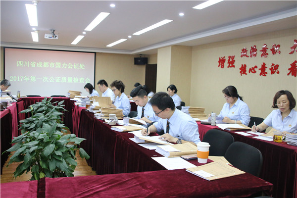 为了进一步提高公证质量,规范办证程序,加强自律管理,5月13日,国力公证处召开2017年第一次公证质量检查会。检查工作严格按照《四川省公证协会公证卷宗质量检查评分标准》规定,坚持依法、客观、公正的原则。国力公证处主任王云筠、党支部书记王翔、副主任张玲、曾国强、主任助理刘晓红、公证三部部长代渝、公证五部部长刘达俊、国力公证处质量管理委员会全体成员及部分行政人员参加会议。