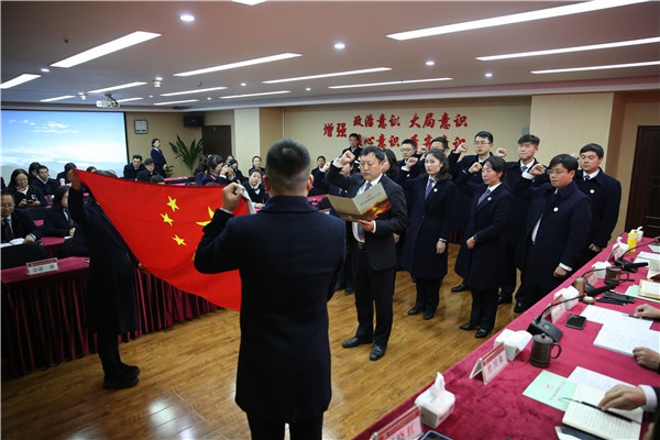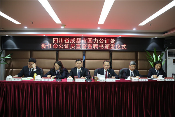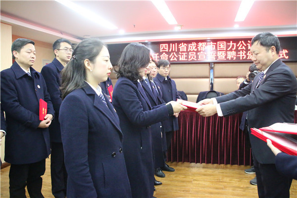 12月24日,四川省成都市国力公证处举行新任命公证员宣誓暨聘书颁发仪式。新任命公证员身着正装,高举右手,在领誓人我处主任王云筠的带领下,面向国旗庄严宣誓。