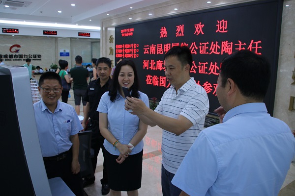 在我处王云筠主任,张玲、曾国强副主任的陪同下,来访同仁实地参观了我处办证大厅、各业务部门及制证室、出证室,深入了解了我处人像比对、房产查询机、“易采通”系统等公证信息化建设成果。