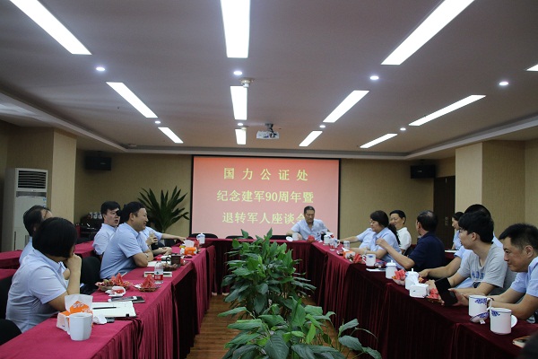 7月31日,国力公证处召开纪念建军90周年暨退转军人座谈会。国力公证处主任王云筠,党支部书记王翔,副主任张玲、朱江、曾国强,主任助理刘晓红,业务三部部长代渝,业务五部部长刘达俊,以及国力公证处退转军人14人欢聚一堂,隆重纪念中国人民解放军建军90周年。会议由张玲副主任主持。