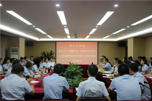 8月9日,国力公证处召开专题学习会议,传达王强副厅长、扎柯会长在全省公证质量管理电视电话会议上的讲话精神,同时学习张军部长在全国公证工作会议上的重要讲话精神。国力公证处主任王云筠,党支部书记王翔,副主任张玲、朱江、曾国强,主任助理刘晓红,业务三部部长代渝,业务五部部长刘达俊,全体公证员,部分业务骨干及行政人员参加会议。会议由张玲副主任主持。