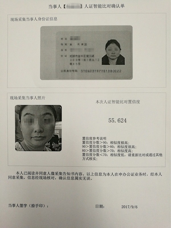 9月5日,当事人杨某向我处申请办理《个人一手住房贷款合同》公证,提供材料齐全。我处人像比对工作人员谢启兵使用“公证易采通”对当事人进行人像比对之后,杨某与身份证比对置信度只有55分,这引起了谢启兵的怀疑。杨某坚称是本人来办理公证,围观群众也认为杨某与身份证照片很像。工作人员随即拿比对结果对杨某进行深入细致地询问,杨某看到比对结果后承认因为姐姐工作太忙所以自己代替姐姐来办理公证,以为是亲姐妹长得很像不会引起公证人员的怀疑。我处随即拒绝办理当事人杨某的公证申请,并通知银行以免造成经济损失。