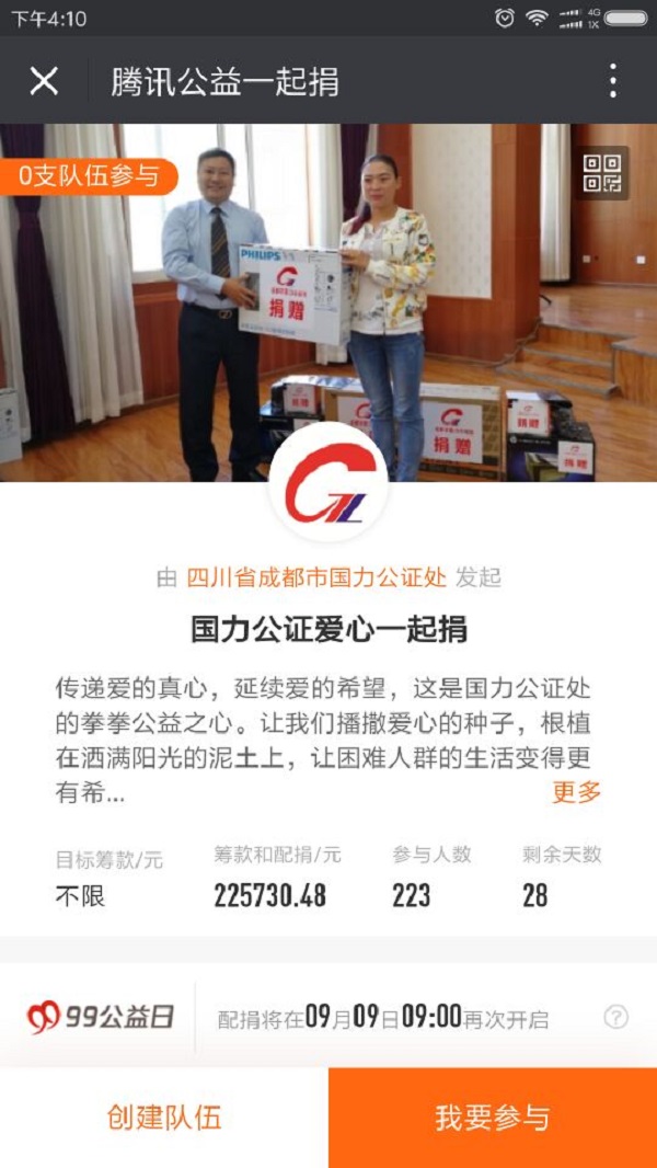 国力公证处始终重视并积极践行社会责任,热心参与慈善公益事业,积极回报社会,此次国力公证处联手“99公益日”,希望借助一个专业的慈善机构和平台,更好地为亟需资助的公益项目提供支持。截止9月8日16时,国力公证处“一起捐”活动已筹得善款225730.48元,共计223人参与。