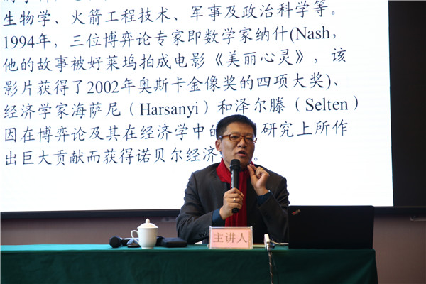 范德胜教授以《博弈思维与竞争策略》为题,首先从不同的角度引出博弈的含义,其次系统介绍了博弈的构成要素和分类,最后结合囚徒困境、情侣博弈、斗鸡博弈等博弈模型对社会经济生活的热点问题进行了分析,令人耳目一新。