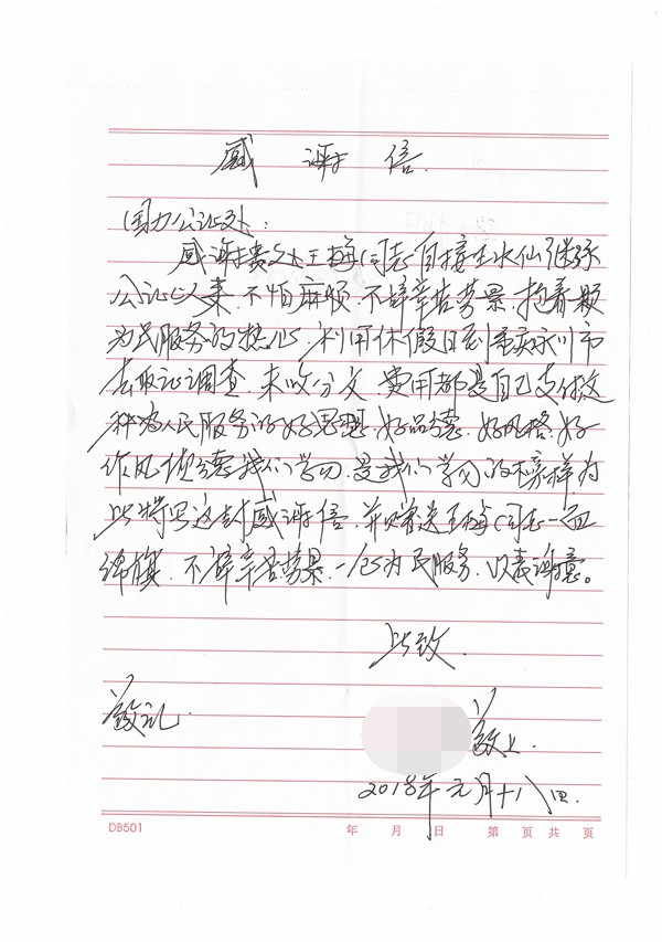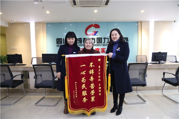 2018年2月5日,当事人王某将写有“不辞辛苦劳累,一心为民服务”的锦旗及感谢信送到国力公证处领导手中,以表达对国力公证处优质服务的衷心感谢。