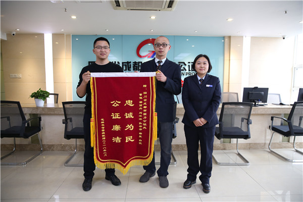 2月28日下午,“花样年智荟城”有关人员将一面印有“公正廉洁,为民服务”的锦旗送到国力公证处领导手中。