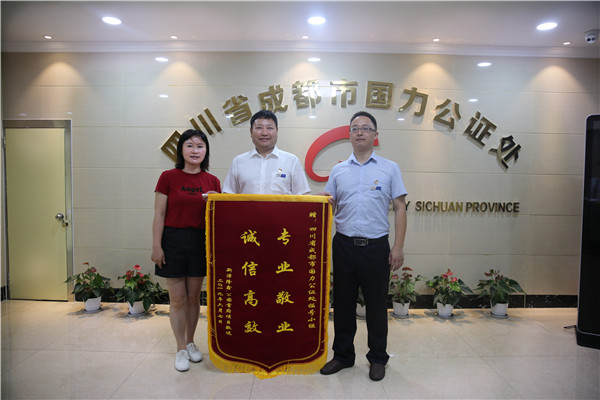 6月11日上午,新津隆鑫公园首府项目的工作人员将一面印有“专业敬业 诚信高效”的锦旗送到国力公证处,对负责该楼盘公证摇号排序选房工作的摇号小组表示感谢。