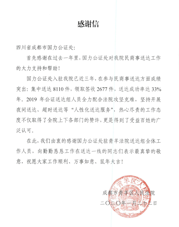 “国力公证处入驻我院已近三年,在参与民商事送达方面成绩突出......在此,我们由衷的感谢国力公证处驻青羊法院送达组全体工作人员!”
