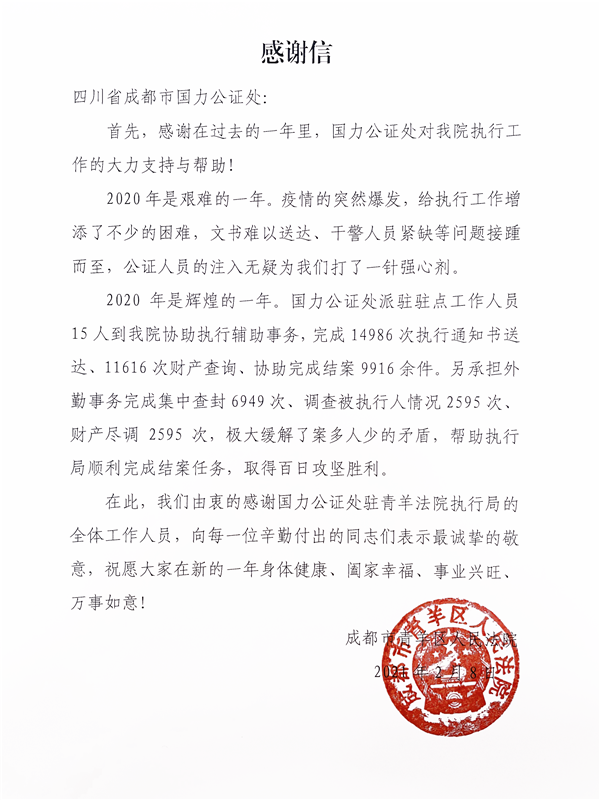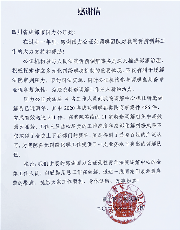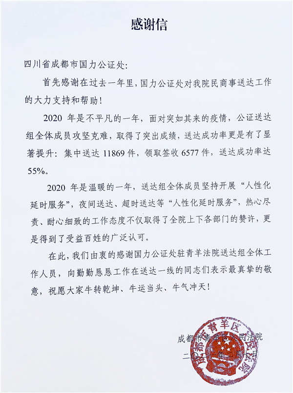 最后,青羊区人民法院再次由衷感谢国力公证处驻青羊区人民法院调解中心、送达组和执行局的全体工作人员,向勤勤恳恳工作在调解、送达、执行一线的同志们表示最真挚的敬意。