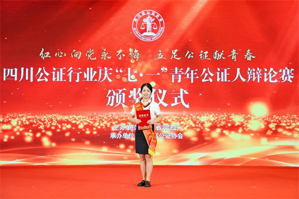 2022年6月26日,四川优秀青年公证员表彰仪式在成都举行。表彰仪式上,我处金融事务部部长潘钇杉荣获“四川优秀青年公证员”荣誉称号。
