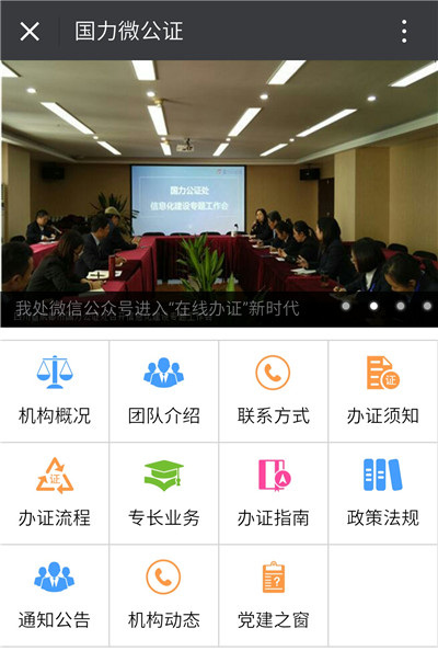 国力公证处为适应新时代公证发展需要,落实司法部《关于进一步加强公证便民利民工作的意见》有关文件精神,践行中央“让数据多跑路,让群众少跑腿”的战略部署,2016年12月29日,在国力公证处主任王云筠、副主任张玲的指导安排下,我处率先开通了国力公证处官方微信微官网服务。通过微官网服务,广大群众可以了解我处的机构概况、办证须知、联系方式、办证流程等相关信息,通过与国力公证处官方网站的联结,微官网实行同步更新,便于广大群众及时在移动设备上了解我处最新发展概况及新闻,随时查看公证员联系电话、办证指南等办证信息,为当事人提供更便捷的办证体验,方便市民及时办理相关公证事项,是我处的又一项便民服务措施。