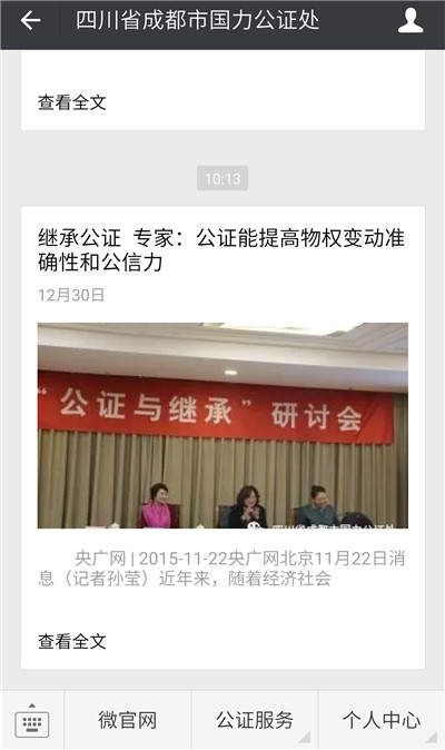访问方法:关注“四川省成都市国力公证处”微信公众号,进入公众号后,点击页面下面的“微官网”进行访问。