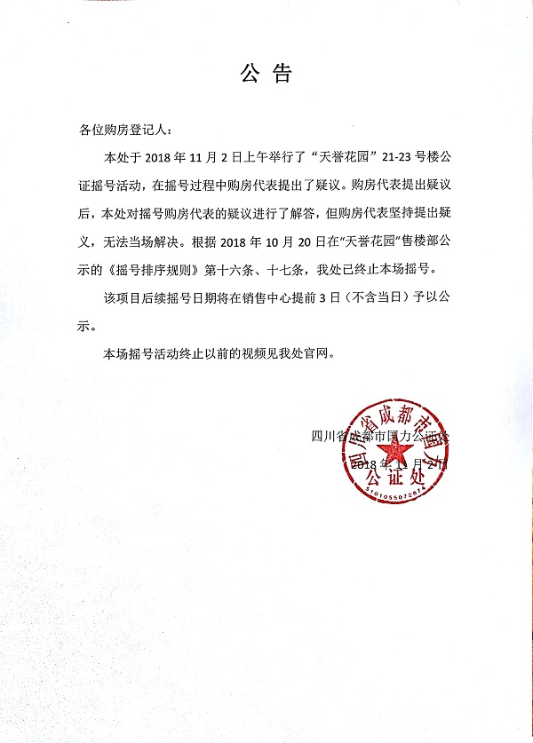 2018年11月2日“天誉花园”21、22、23号楼商品住房本场公证摇号排序活动终止前的现场录像