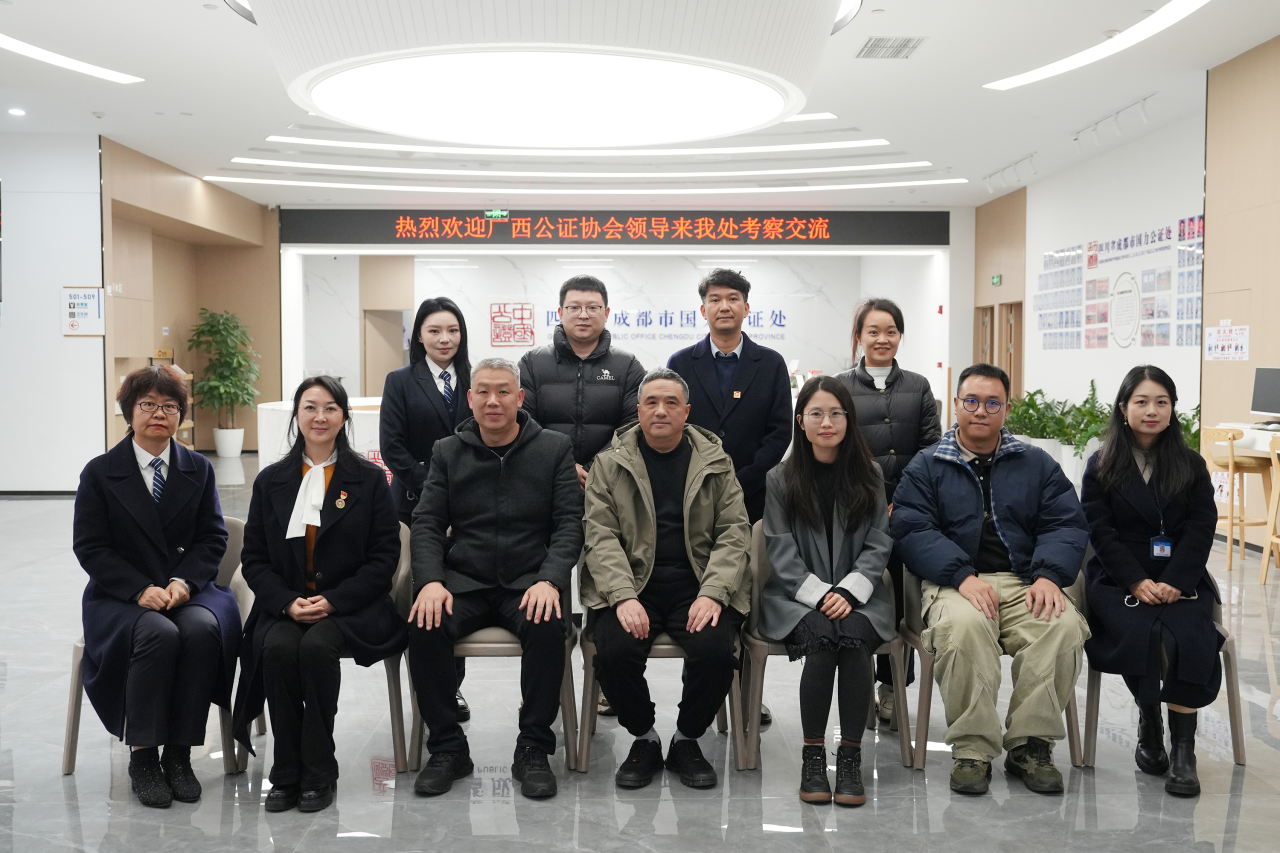 2026年1月13日下午,广西公证协会会长、南宁市东博公证处主任方明带队赴我处考察调研,四川省公证协会秘书长梅勇、副秘书长杜翔陪同。